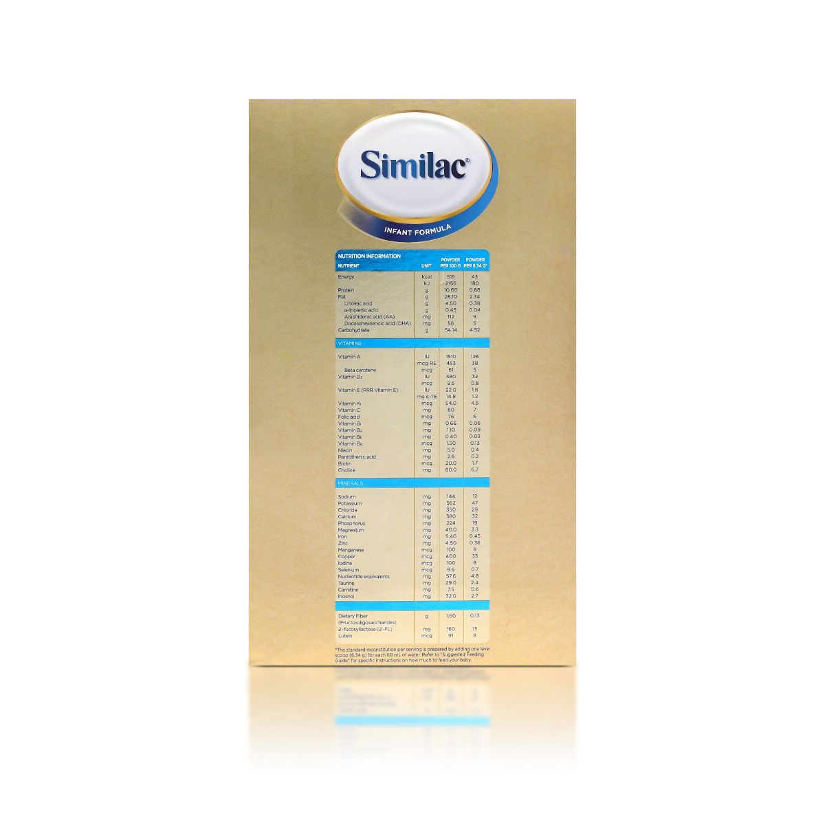 Similac - Abbott Nutrition | Nutrition Science, Products, and Research INGREDIENTS FEATURES Designed to support the immune system, brain development, and digestive health. 5 HMO Prebiotics. HMOs are immune nourishing prebiotics structurally identical to those in breast milk. DHA, lutein, vitamin E. Similac 360 Total Care is our closest formula to breast milk. Similac® Sensitive® | For Babies Sensitive to Lactose Refer to label for most accurate information. Nutritional composition and ingredients may vary slightly between formats. POWDER Per 100 mL at standard dilution Energy (Cal) 68 Protein (g) 1.47 Fat (g) 3.68 Linoleic acid (g) 0.52 Linolenic acid (g) 0.05 Docosahexaenoic acid (DHA) (g) - Arachidonic acid (ARA) (g) - Carbohydrate (g) 7.24