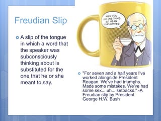 Freudian Slip: Meaning, Examples, Other Explanations A Freudian slip, or parapraxis, refers to what you might also call a slip of the tongue. It's when you mean to say one thing but instead say something entirely different. It commonly happens when...