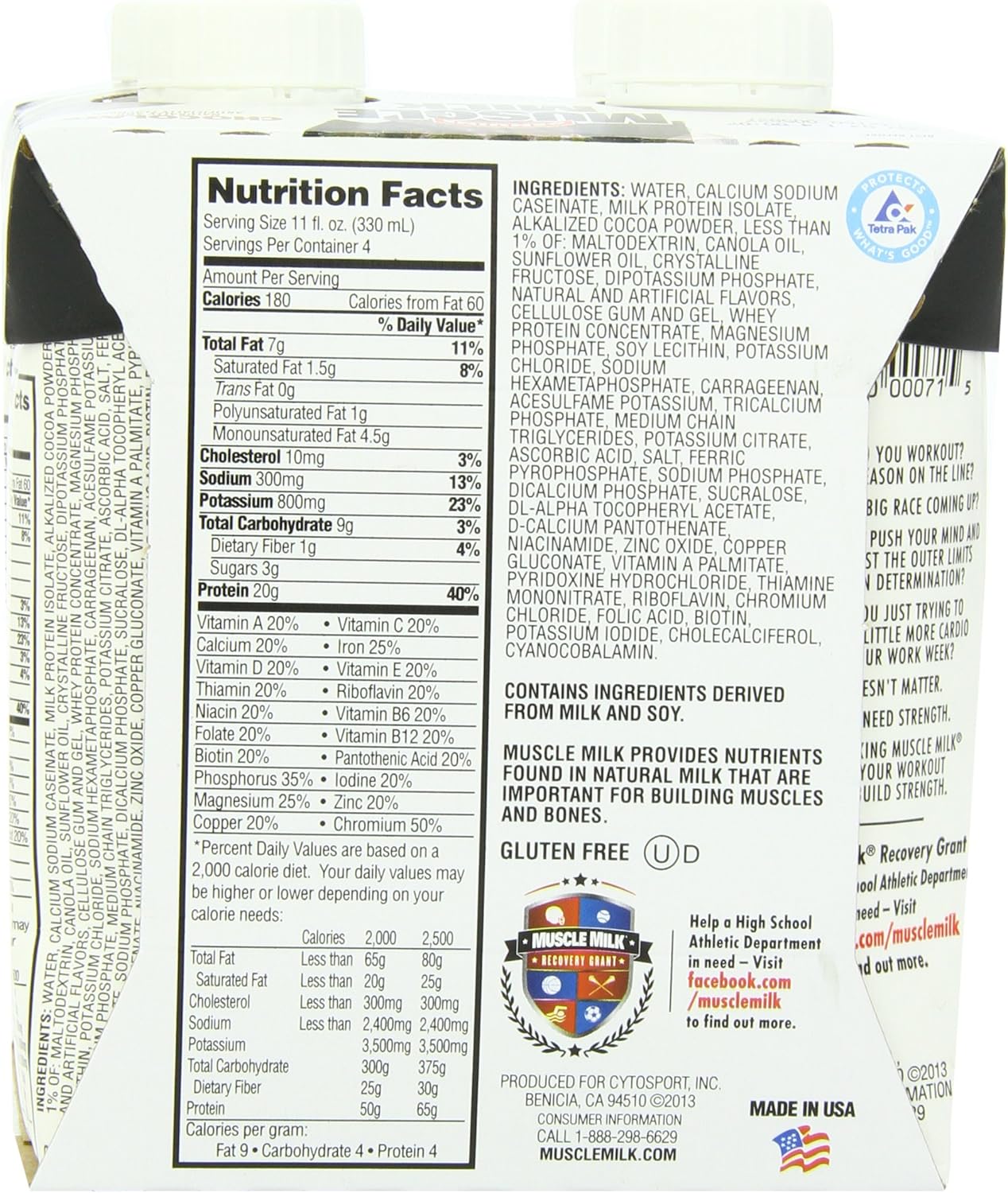 Muscle Milk Pro Series | ProteinPowder.com It contains 50grams of protein, 5grams of fat and 17grams of carbs in each 82gram serve. Nutrition Facts Label A sample nutrition label is supplied for this product. Some variation can occur between flavours. Intense Vanilla We endeavour to provide detailed product information to keep our visitors informed to make better choices. Muscle Milk: 3 Major Side Effects - Healthline Muscle Milk has become a ubiquitous nutritional supplement drink. It's found not only in supplement stores, but also at most corner markets. Its ingredients, according to its website, include... Muscle Milk Nutrition Facts. Calories, carbs, fat, sodium & more ... Get nutrition information for Muscle Milk items and over 200,000 other foods (including over 3,500 brands). Track calories, carbs, fat, sodium, sugar & 14 other nutrients. ... Muscle Milk Genuine Protein Powder - Peanut Butter & Chocolate. 2 scoops (70g) Nutrition Facts. 310 calories. Muscle Milk Review Of Ingredients | Supplement Clarity Protein In Muscle Milk The supplement provides a good amount of protein - 16 grams in 1 scoop and 32 grams of protein in 2 scoops. The protein in Muscle Milk comes these ingredients, as they appear in order on the ingredients label: Calcium sodium caseinate Milk protein isolate Whey protein isolate Whey Protein Hydrolysate Whey protein concentrate
