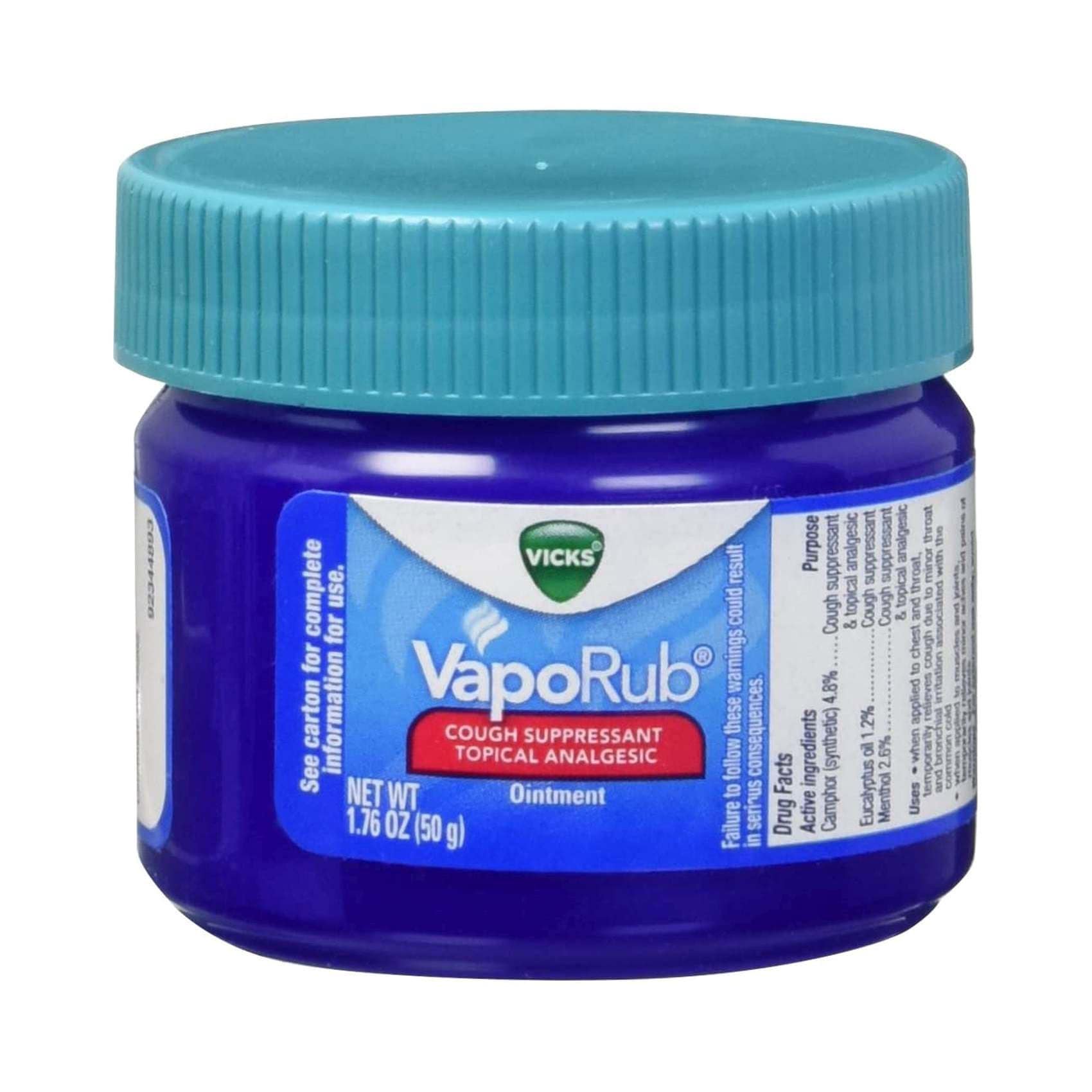 Vicks Vaporub Cough Suppressant Ointment : Target Ive been using Vicks vaporub topical cough suppressant for a couple days every night due to muscle aches on my neck and shoulders, I apply a quarter size of Vicks and rub in well until it absorbs. I like the Menthol scent and thick and clear like petroleum consistency that makes it easy apply on my chest to help me sleep well at night because, I have a stuffy nose.