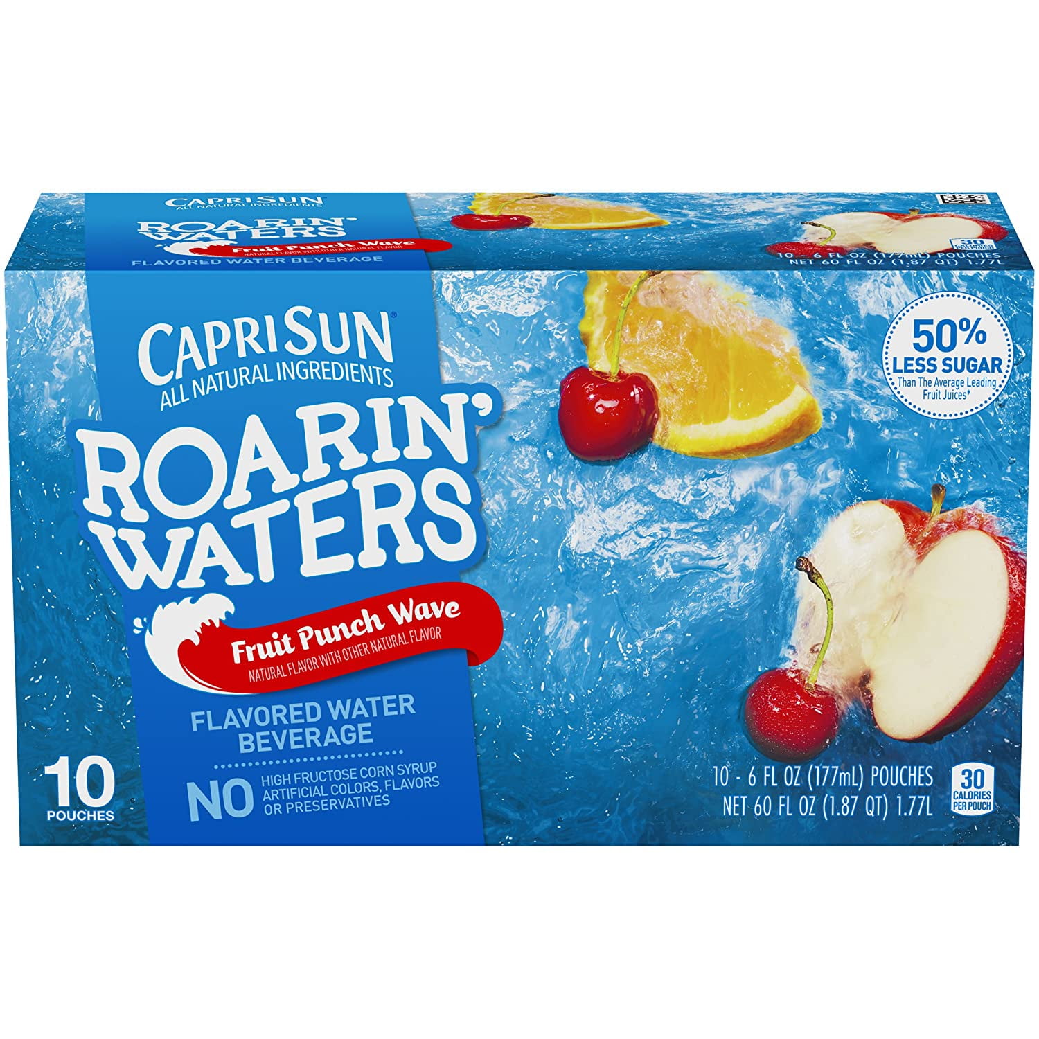 Capri Sun Roarin' Waters Fruit Punch Wave Water Beverage, 10 ct Box, 6 ... Capri Sun Roarin' Waters Fruit Punch Flavored Water Beverage packs a punch of your favorite fruit flavors in every pouch. No artificial colors, flavors or preservatives. Now with all natural ingredients, no artificial sweeteners and naturally sweetened with sugar and stevia leaf extract. NUTRITIONAL INFO PRINT Nutrition & Ingredients