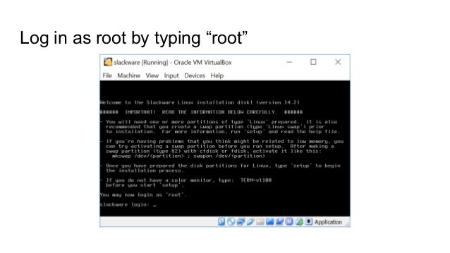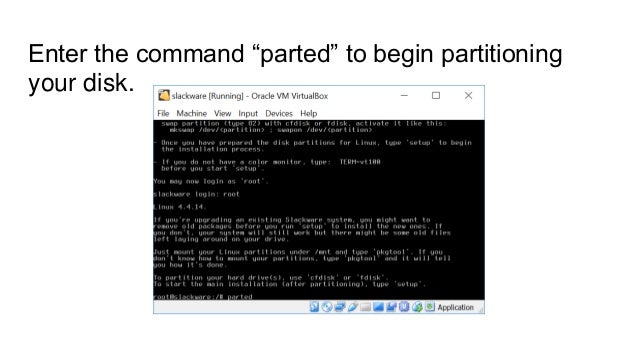 slackware:install - SlackDocs Mar 15, 2014 · After making a swap partition (type 82) with cfdisk or fdisk, activate it like this: mkswap /dev/ ; swapon /dev/ - Once you have prepared the disk partitions for Linux, type 'setup' to begin the installation process. - If you do not have a color monitor, type: TERM=vt100 before you start 'setup'.