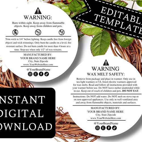 Editable Wax Melt Warning Label Template Wax Melt Safety - Etsy 1 wax melt warning label template 2"x2" 1 wax melt warning label template 1.75"x1.75" 1 wax melt warning label template 1.5"x1.5" video tutorial with explanation how to use it in canva Edit for free in CANVA:just create a free account if you don't have, and start creating 🟡edit texts 🟡change background